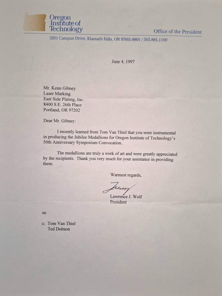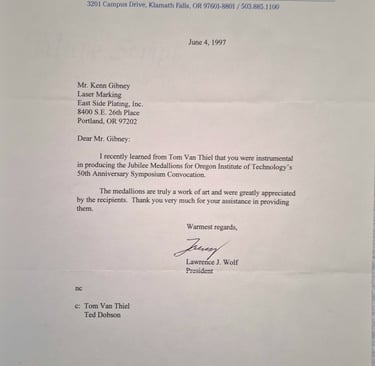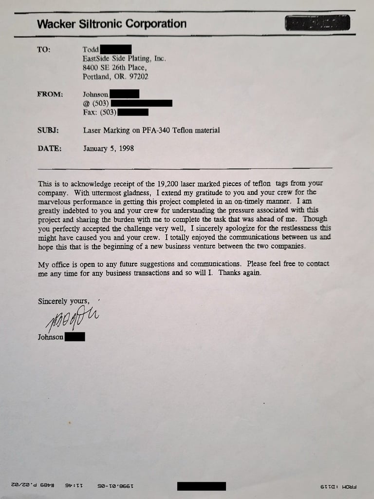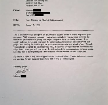 Known as "The Man Who Marked the Impossible", our founder has spent three decades pushing the boundaries of laser technology. From the early days of doing R&D with Yag and CO2 lasers to mastering intricate designs on everything from metal and wood to powder coating to acrylic, he's tackled challenges that others deemed unachievable. He developed an industry-first process for permanently laser marking pfa340 teflon for Wacker Siltronic in 1997, which still stands today. See letter below: